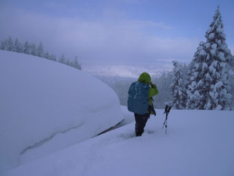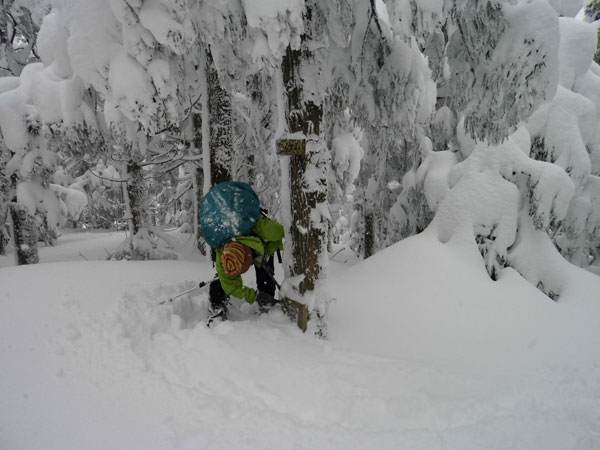 穏やかな稜線に出てから、トレースが風雪に消されたのかファージーになった。八乙女峠の東屋付近では全くなくなっていた。その先は、もちろん膝上ラッセルになってしまった。それ程の距離でもないし、高度差もないから、「せめて三角点まで行かなくちゃ!」 となったが、「山ノ神」 は、「行くがけ・・」 と渋々の感があった。