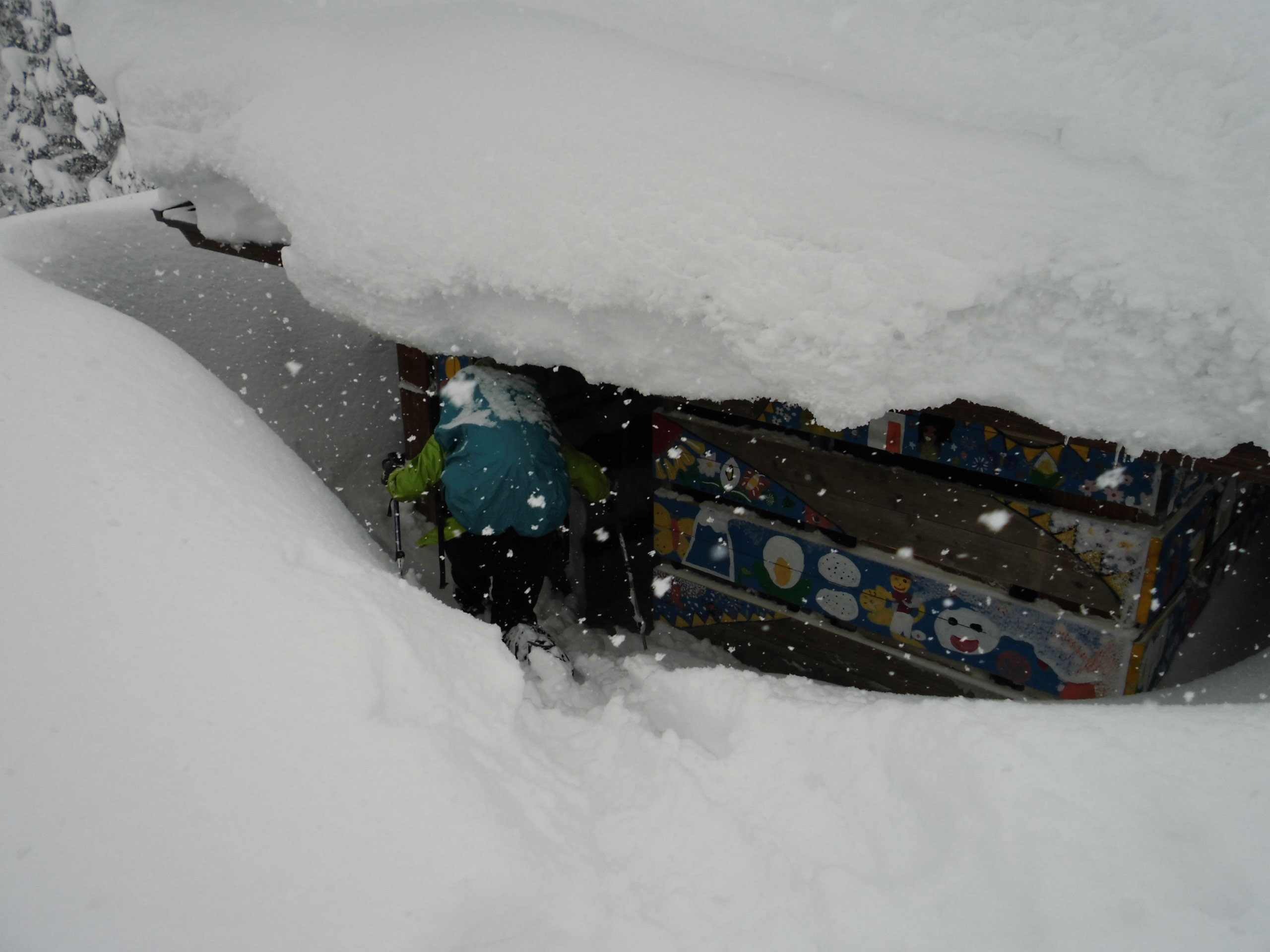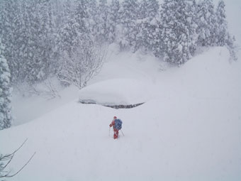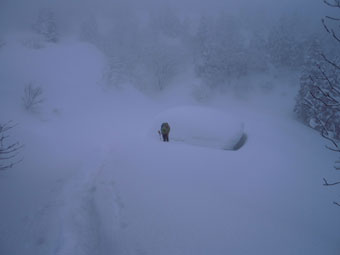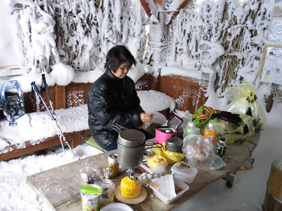 のち、急斜面を降って、東屋に戻った。本来なら牛岳を望める所で、シェルター造って、食事をしたかったのであるが、何も見えないのであるから、八乙女別荘にお邪魔する事にした。その東屋は、周りが囲まれており風が入らない。ましてや大量の雪でも囲まれており、まるで二重構造というところかもしれない。それでも-2℃。