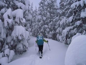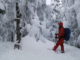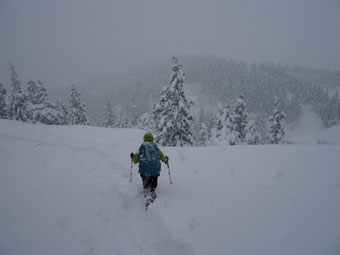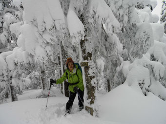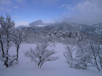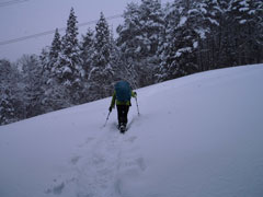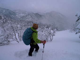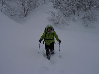 登山道にトレースがあって歩き易かったが、新雪が20cm程度積もっていた。時々、陽が差したかと思っても、すぐにガスに覆われ風雪となった。そのような空模様が、ずっと続いた感じであったが、「まだまし」 と思うようにした。