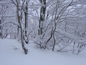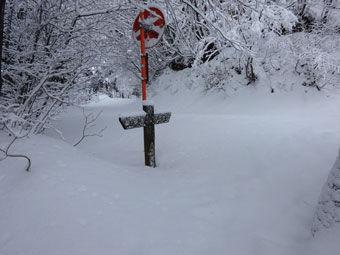 閑乗寺公園に着いたら、積雪(新雪)が15cmくらいあった。上に行くと、当然雪量が増えるのであるから、そのラッセル如何では、途中敗退も有り得るのではとの不安が付いて回ったが、当面の目標は、八乙女峠の東屋までとした。