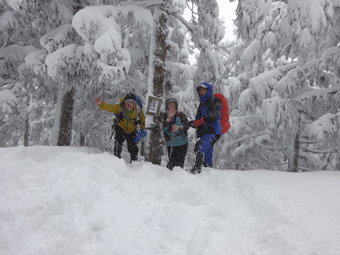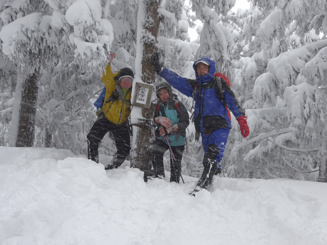 | 雪降りしきる中、八乙女山三角点で・・・ |