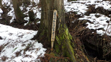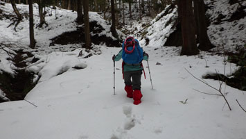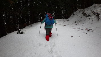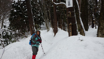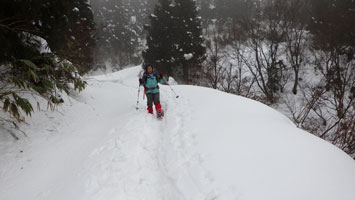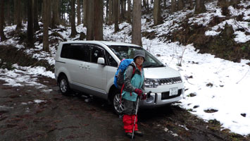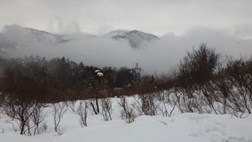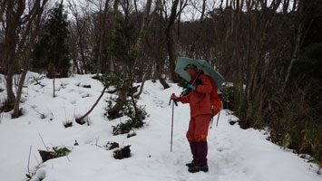 1/20 いろいろあって、時間の目安も立て易い八乙女山にした。強く降らなかったが、ずっと雨だった。雪量が少ないと思い林道奥まで乗り入れようしたが、倒木があり、あえなくストップ。それではと、斜面を登ったが、雪があまりない上に、谷に降りなければならないのでは、元に戻り林道歩きとなる。