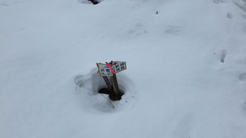 トレランのルートを歩いてみた。登山道より雪量があった。そして、高度を上げると予想以上に雪があった。もちろん、例年よりは少ないのであるが、スノーシューがあっても良かったくらいである。今日は、見込み違いと言うほどではないが、カンジキを担いでツボ足である。9合目辺りから、完全にスノーシューの方が楽という感じである。