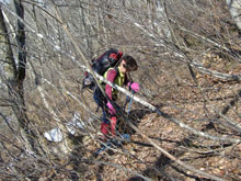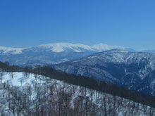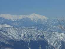 立山周辺や槍穂辺りが霞んで来た頃に、山頂を後にした。ヤブを避けようとして、往路より東側の斜面を降りたが、やっぱりヤブに代わりがなかった。帰り道の林道歩きは、フキノトウ採りに精出しその辛さはない。