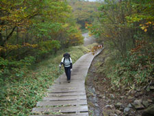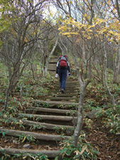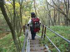 長い木道の階段が続く |