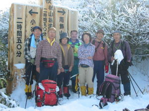 集合場所の黒部ICでは、「山のママ」からの差し入れがあり、意気揚揚と雨飾山に向かった。2~3日前から悪天の予報で、かなりの積雪が予想され、各車には冬タイヤ装備となったが、気温こそ下がったものの雪はあまり降らなかった。林道も凍結の心配もなく、雨飾山荘前に到着してみて、眼前の鋸岳や鬼ヶ面山は真っ白であったが、登山口付近は、木陰や陽の当たらない所に薄らと雪があるだけであった。しかし、その分絶好の山行日和になった。