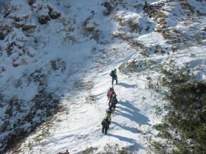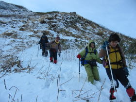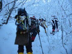 雪量がどれだけだか想像がつかず、カンジキは持参し、アイゼンは外す事にした。アイゼンが使わなければならなくなったら、潔く撤退する事にし、イザという時のためにピッケルだけは数本用意した。