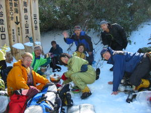30cm前後の雪量を確認しながら、1700mくらいで一息入れるが、上部の真っ白になった樹木のあの稜線が頂上ではないかの意見に、頂上だと思って行っても、そこが頂上であったためしがない。の誰ともなく言った言葉に、皆ニッコリうなずきながら足を進めた。