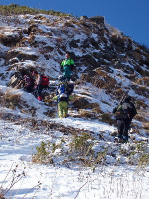 しかし、笹平は、登山道には雪があるものの、この時期でも本当に笹平なのである。笹平からチョッピリ下って、岩場に取り付くのであるが、万が一のため、ストックを収納しピッケルを準備している間に皆が岩場に取り付こうとしていた。