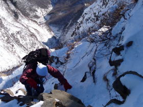 この時点で、4年前の「山ノ神」が、凍り付いたその岩場で、ニッチモサッチモいかなくなってしまった事が脳裏を掠め、登頂断念も心してしまった。