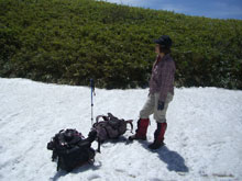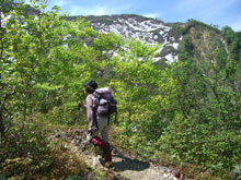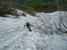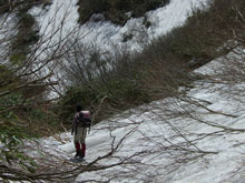 中ノ池付近から残雪が現れ、山頂と小谷への分岐までの標高にして250~300m間の急斜面に、びっしりと雪が着いていたのである。「こんな所を登るの? あの虎ロープ付いている所だろ!」 と山ノ神が不安そうな顔をした。