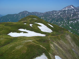| 北峰から、まだ白く光る北アの峰々を望む。 |