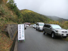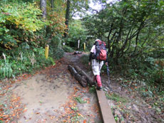 | 駐車場は満車。路肩駐車容認の標識。 | 木道を歩き、実質上の登山口へ・・ | 徐々に色付き始めた樹木が現れる。 |