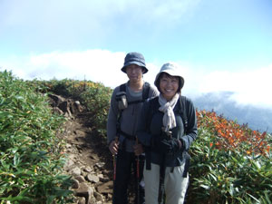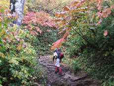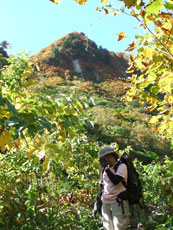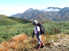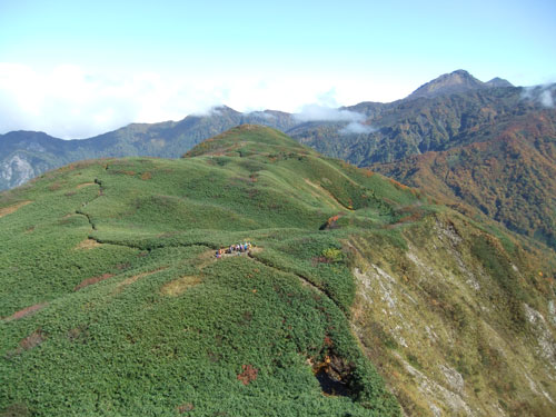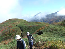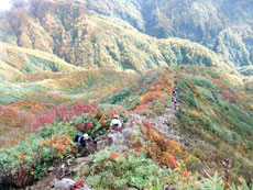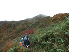 | 今日は、コツコツいいペース。 | ガスが晴れ、振り返って見渡せば・・ | 金山・天狗原山方面の紅葉は素晴らしい。 |