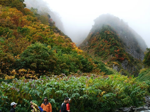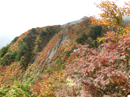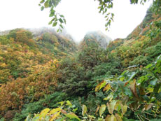 | 雨が上がり、荒菅沢源頭方面の紅葉ショーが始まった。 |
