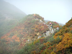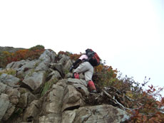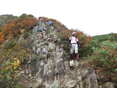 | 荒菅沢の岩稜に、際立つ木々の色付き |