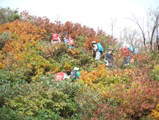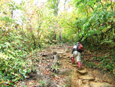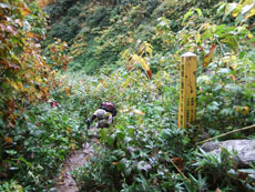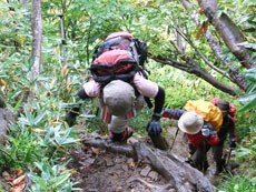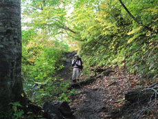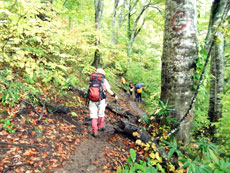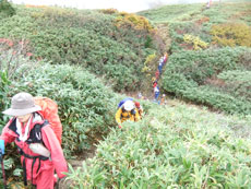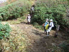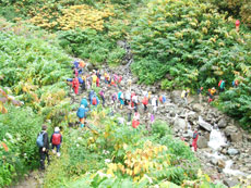 | 手が加えられた登山道を行く。 | ブナ平へ・・・ | 荒菅沢には大勢の登山者が休息を・・ |