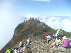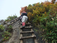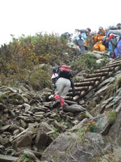 | ちょっとした岩場を乗り越えて・・ | 梯子も・・・ | 振り返れば、登山者が続々やって来る。 |