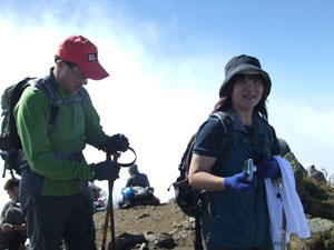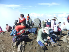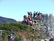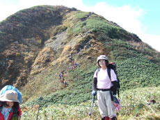 | 笹平には、長い列が出来ていた。 | 焼山をバックに・・・ | 山頂への最後の登りをバックに・・・ |