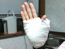 | 自力で下山。頑張った! | 手と足の痛みを堪えながら・・・ | グルグル巻きの右手(病院での治療後) |
