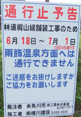 6/18 シラネアオイに遭いたくて、17回目の雨飾山。糸魚川市山口から根知川を渡ったところで、舗装工事のため通行止めの標識が立てられていた。それがなんと、今日から7/1までなのだから、がっかりである。1時間ぐらいなら歩いても構わないのであるが、何処の工事か分からないのでは、どうしようもない。