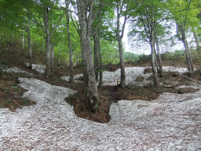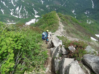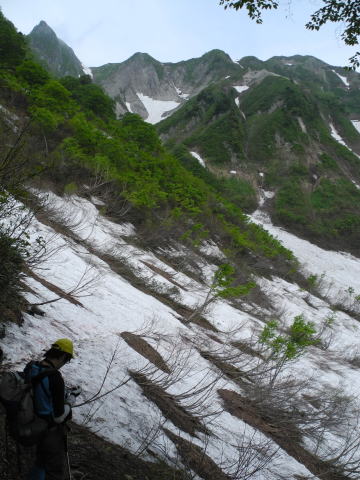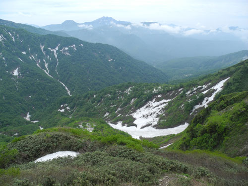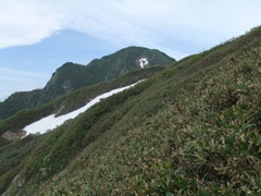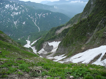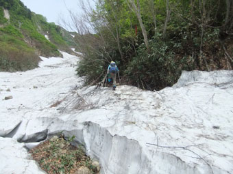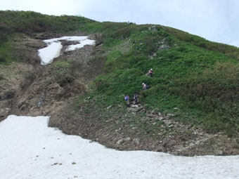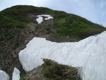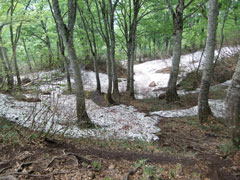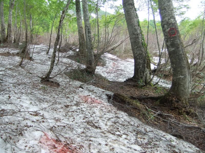 | 荒菅沢に降りる前の斜面も雪に覆われていた。 |