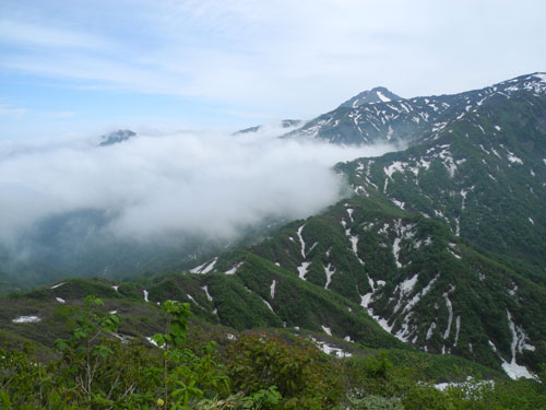 | 金山への稜線にガスが掛かろうとしている。奥は焼山。 |