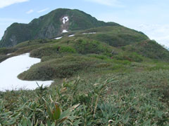 | 荒菅沢源頭から雨飾山頂を見上げる。 |