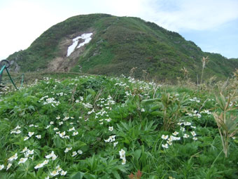 | ハクサンイチゲ越しに山頂を望む。 |