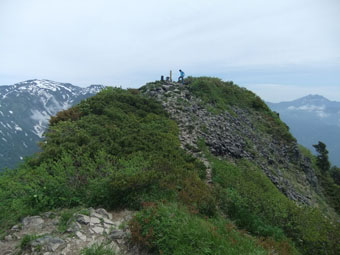 山頂に連なる岩場を登る登山者。 |
