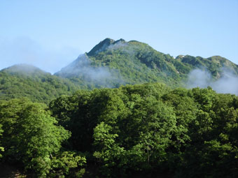 | 林道から雨飾山を望む。 |