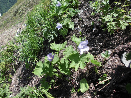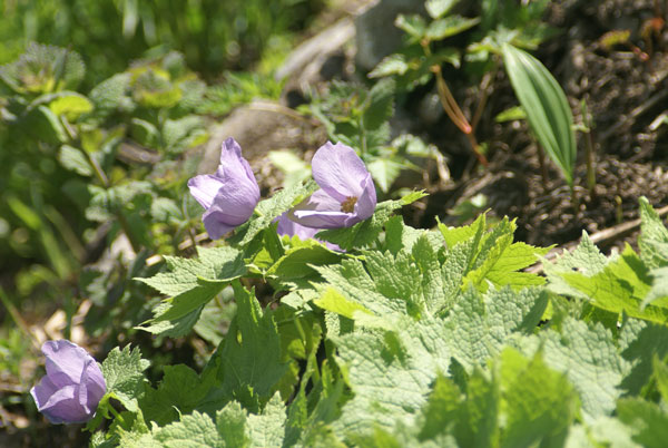 お目当てのシラネアオイの群落は、既に盛りを過ぎており、元気のない姿を晒していた。「もう一週間早ければ・・」 と言ってもも仕方がない事で、元気な物を探す事になった。笹平にも、たくさん咲くのであるが、ハクサンイチゲと共に、その光景をみる事が出来なかった。