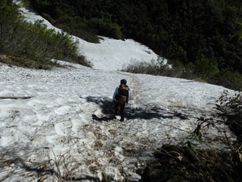 気持ちよく雪渓を行く。 |