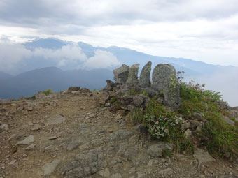 糸魚川地方は、午後から雨の予報であったが、登るに連れ、曇り空に、所々青空が覗いて来た。しかし、山頂付近だけは、薄黒い雲に覆われているのが分かった。時折吹く、穏やかな風は心地よく、私にとっては、汗を掻かないでもよいステキな風であった。