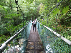 | スタート地点に立つ「山ノ神」 | すぐに常念岳との分岐に出る。 | 10分程行くと、鉄製吊り橋がある。 |
