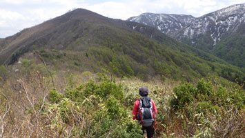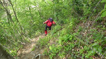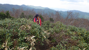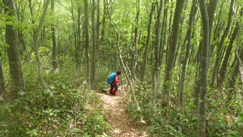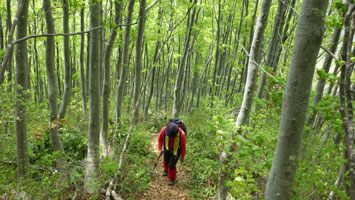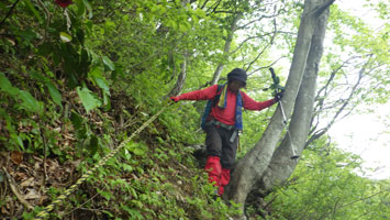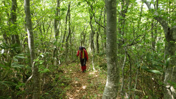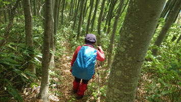 しかし、虎ロープが連続に施してあるような急登であったが、富山の山を歩いている者にしては、左程苦にならない。そして、長く続くブナ林が素晴らしく良かった。軽く思っていたが、「山ノ神」にしてみえば、結構しんどかったようであった。