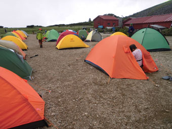 午後4時頃、テン場に戻り、テント前で宴となった。テン場は、ぎっしりと埋まり、賑やかであったが、我々は、二人だけの静かな宴であった。座る事の苦手な私は、どうも落ち着かず、二つしかないテーブルの空きを見付け、そこに宴会場を移した。