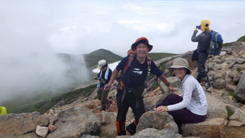 室堂でコーヒータイムを付き合って頂いた。山頂へも一緒して頂いた。山頂で食事としたのであるが、何もかもが良いように動いたのであろうか、雲間から青空が覗いたのである。視界も時々であるものの、パーッと開けるし、雲海の雰囲気も漂わせてくれたのである。雨予想がこのように鳴るのであるから、山はやめられない。