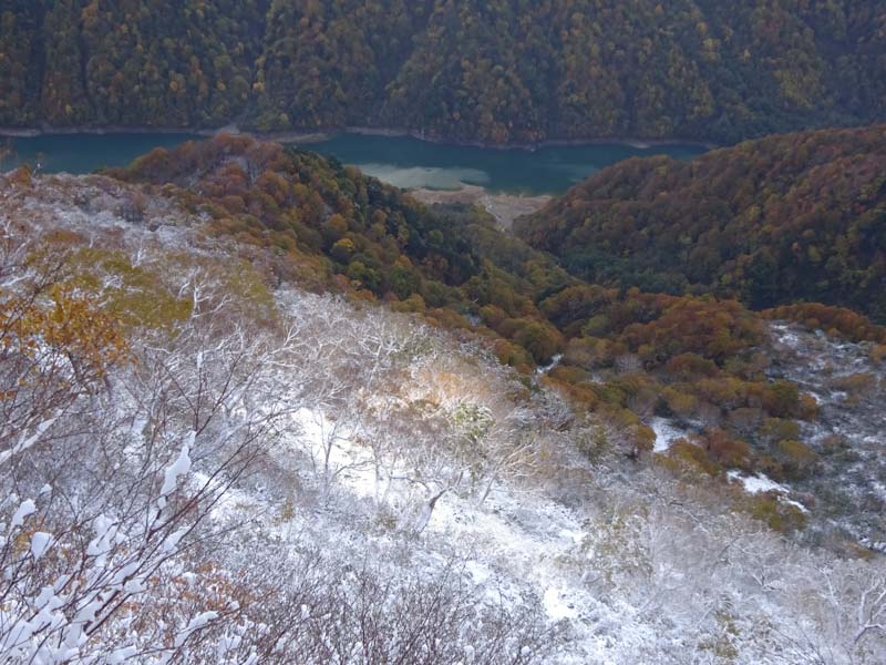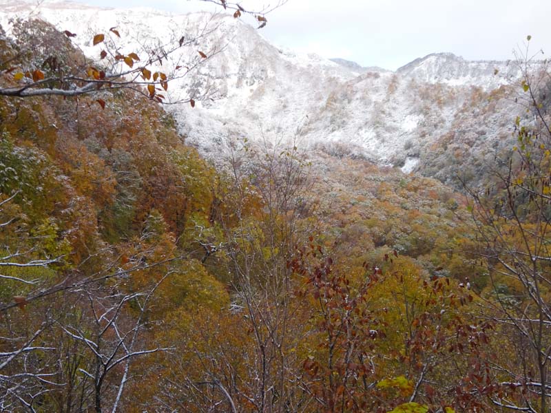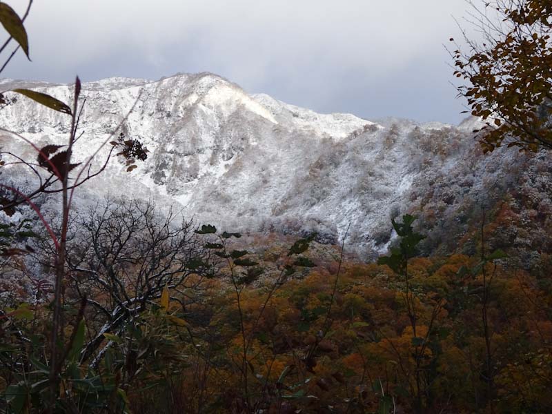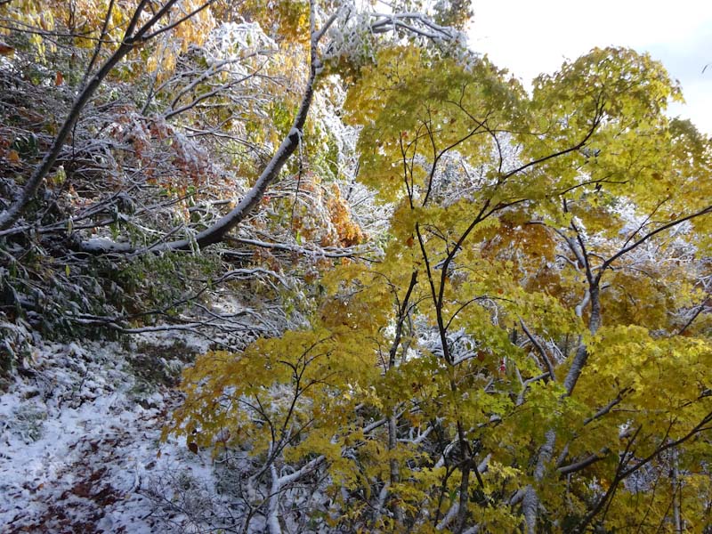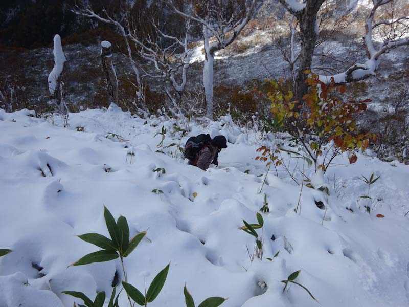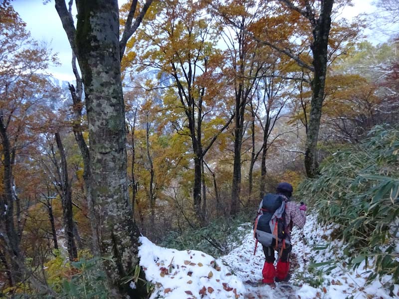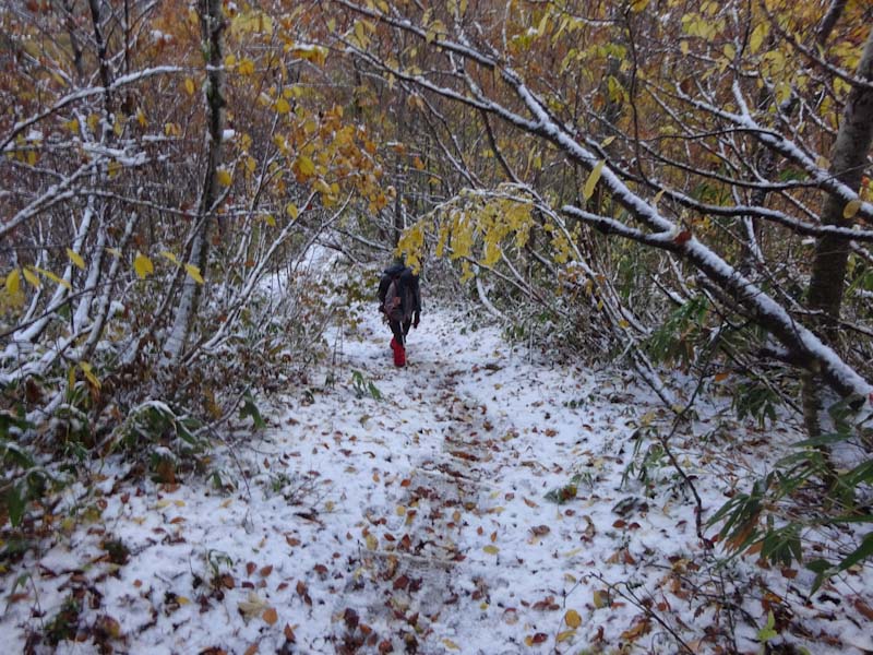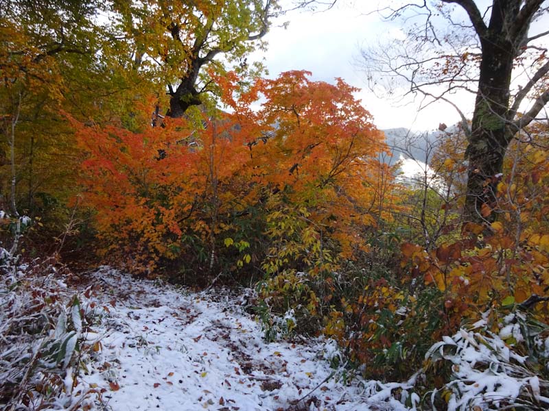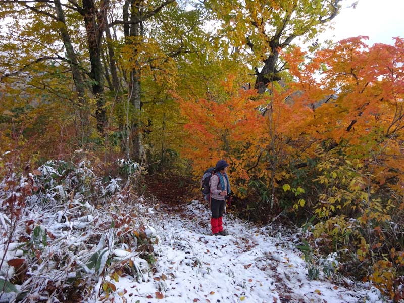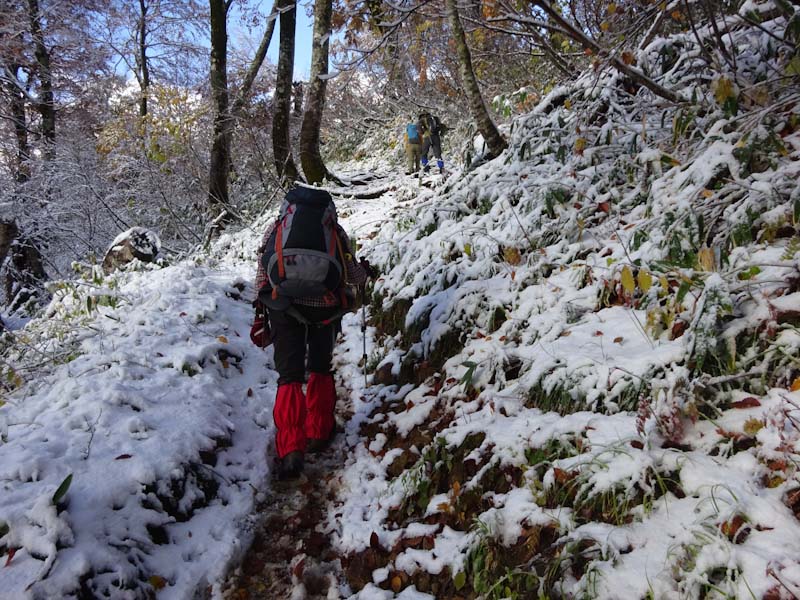 日曜日ともあって、多くの登山者が押し寄せていた。白水湖登山口にさえ、ちょっぴり片隅に雪があった。すぐに雪が現れ、紅葉とのマッチングが素晴らしかった。2キロくらいから雪道になり、3キロでは完全な冬山であった。私達はそこでアイゼンを着けた。登山道は踏み固められ、そのままでも良かったのであるが、知人から頂いたアイゼンの ” 試し履き ” もあった。