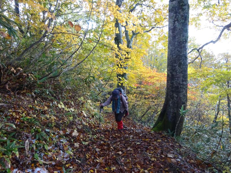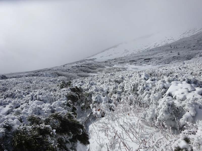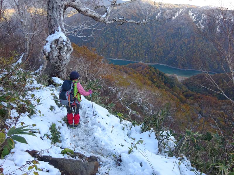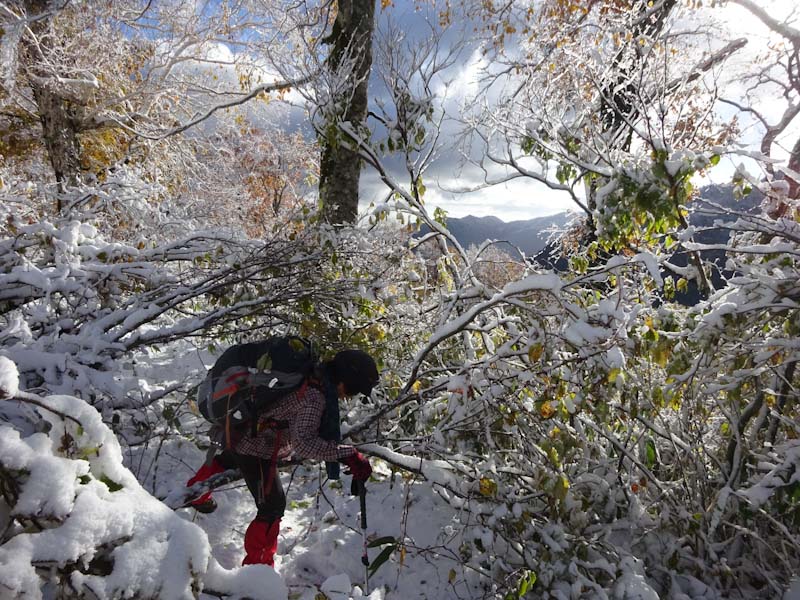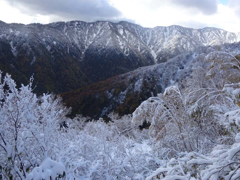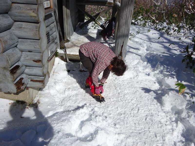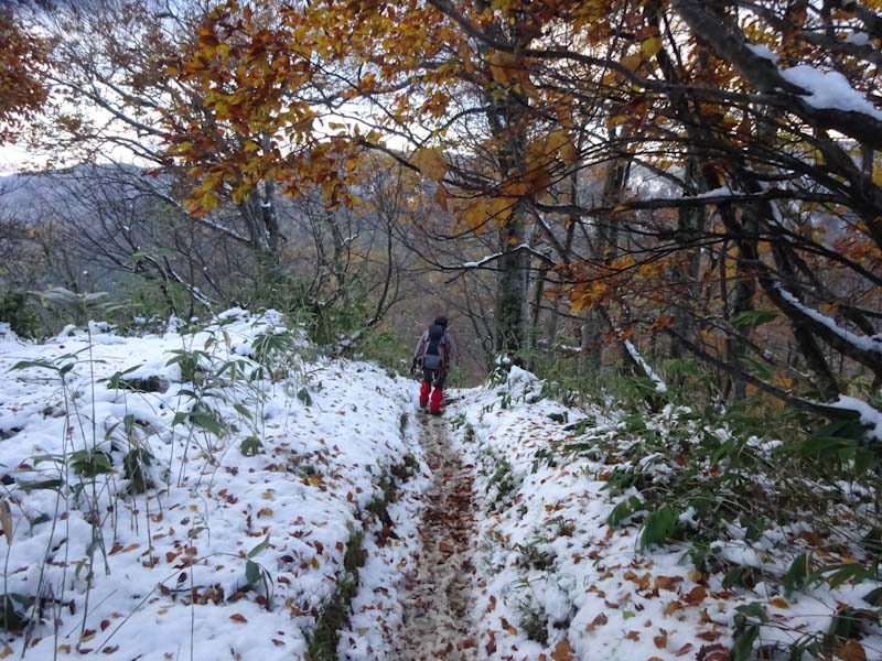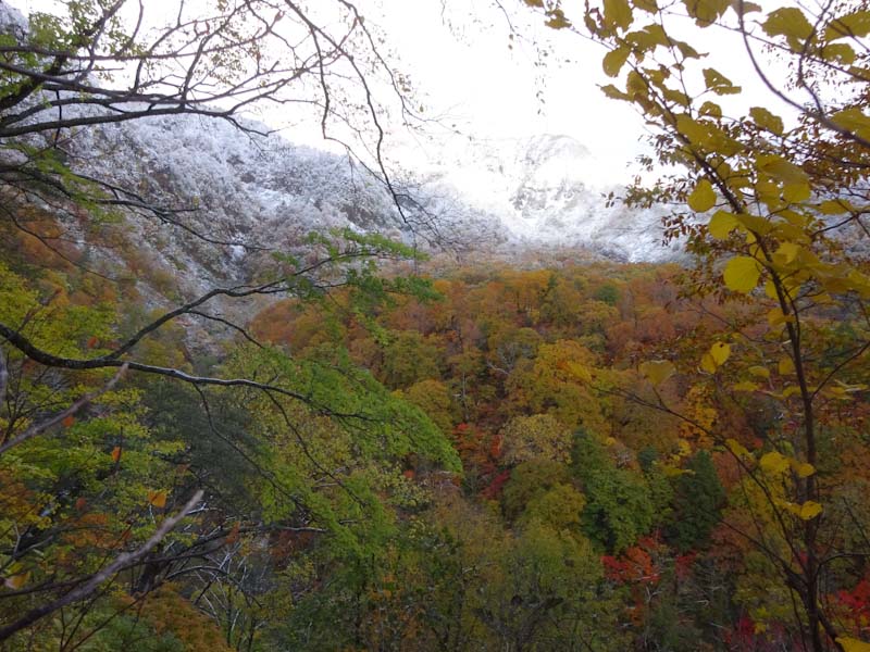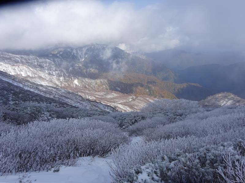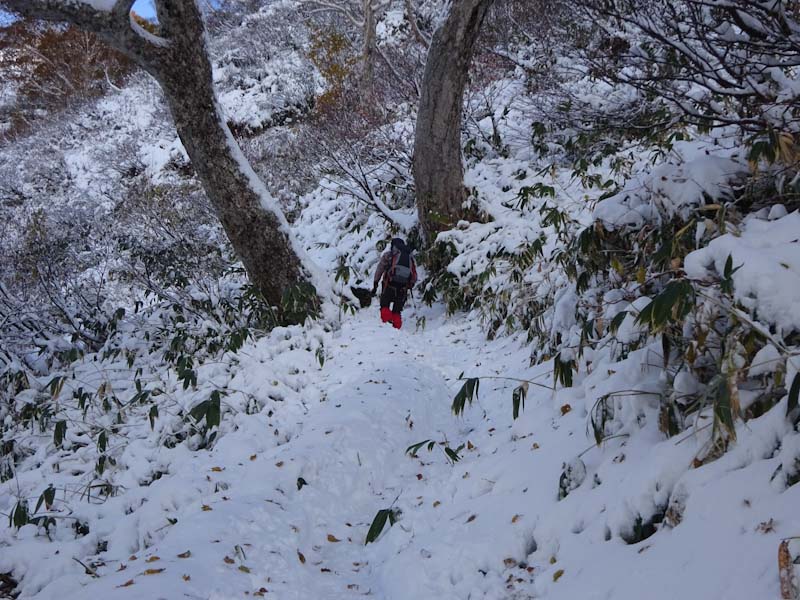 日曜日ともあって、多くの登山者が押し寄せていた。白水湖登山口にさえ、ちょっぴり片隅に雪があった。すぐに雪が現れ、紅葉とのマッチングが素晴らしかった。2キロくらいから雪道になり、3キロでは完全な冬山であった。私達はそこでアイゼンを着けた。登山道は踏み固められ、そのままでも良かったのであるが、知人から頂いたアイゼンの ” 試し履き ” もあった。