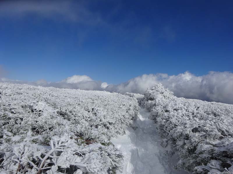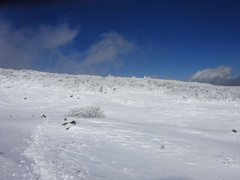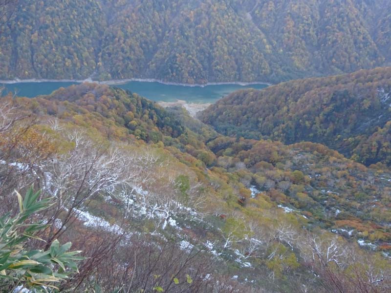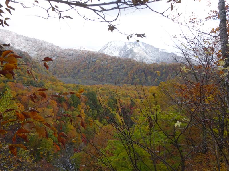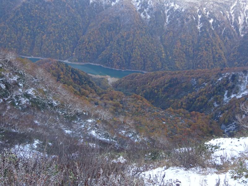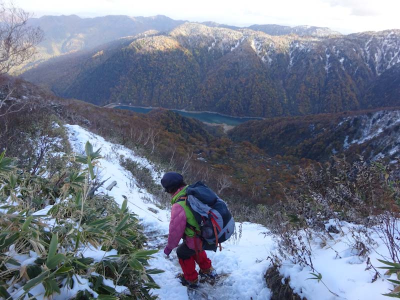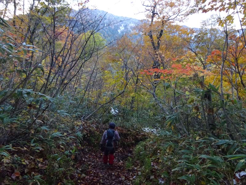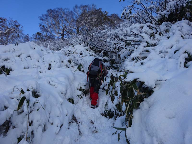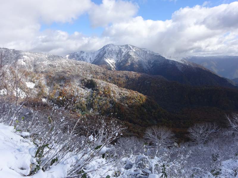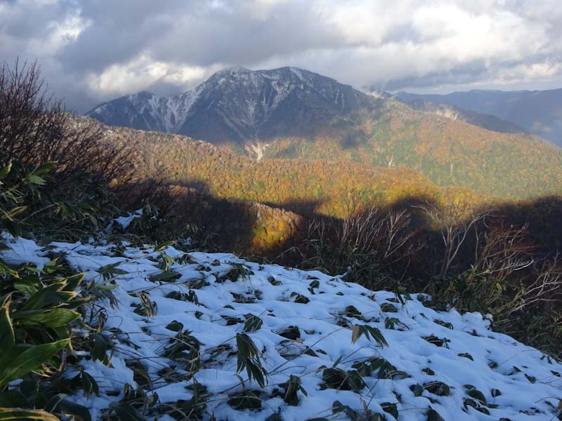 日曜日ともあって、多くの登山者が押し寄せていた。白水湖登山口にさえ、ちょっぴり片隅に雪があった。すぐに雪が現れ、紅葉とのマッチングが素晴らしかった。2キロくらいから雪道になり、3キロでは完全な冬山であった。私達はそこでアイゼンを着けた。登山道は踏み固められ、そのままでも良かったのであるが、知人から頂いたアイゼンの ” 試し履き ” もあった。