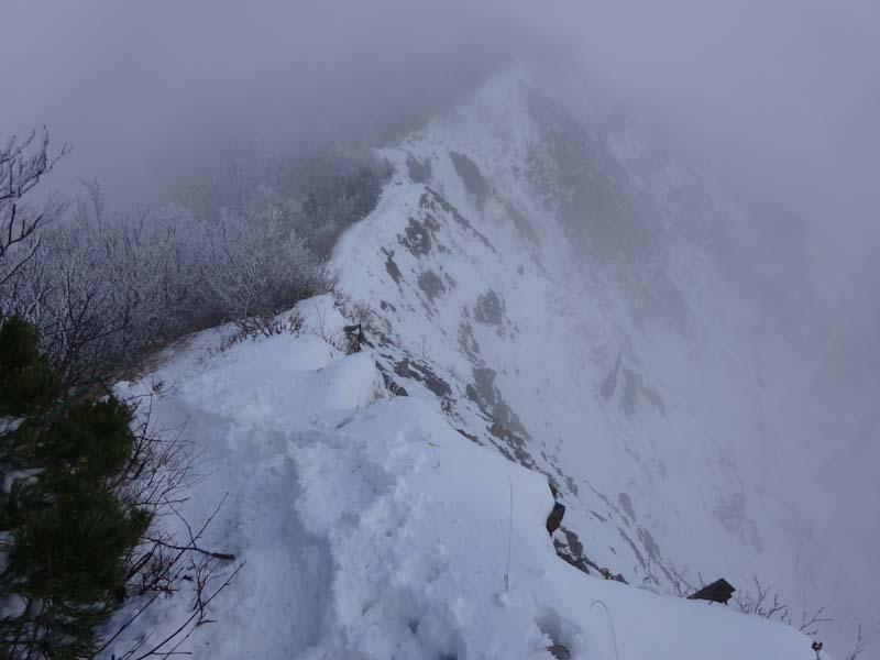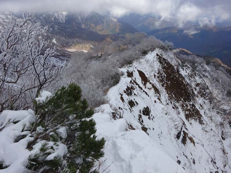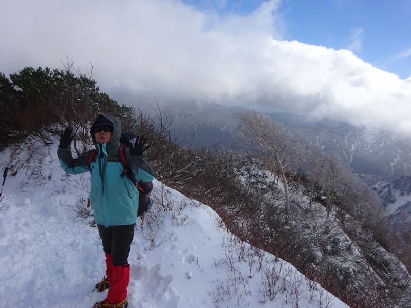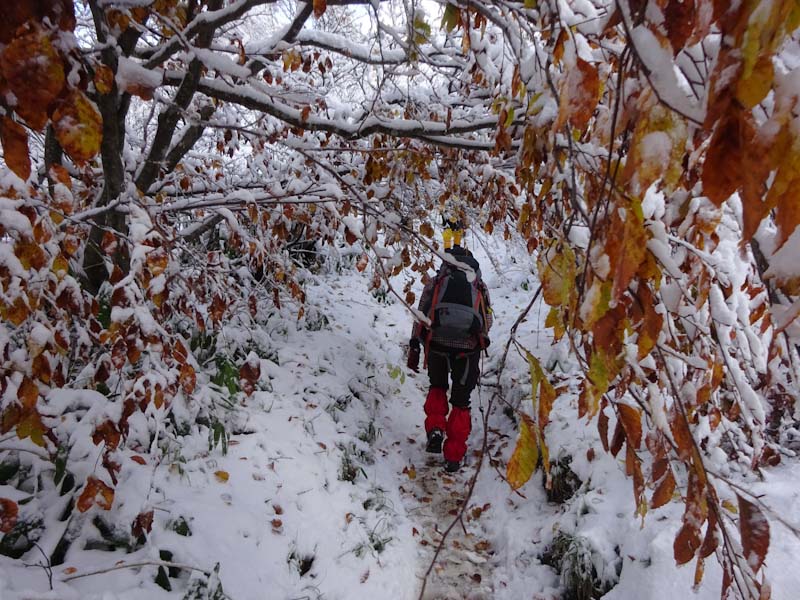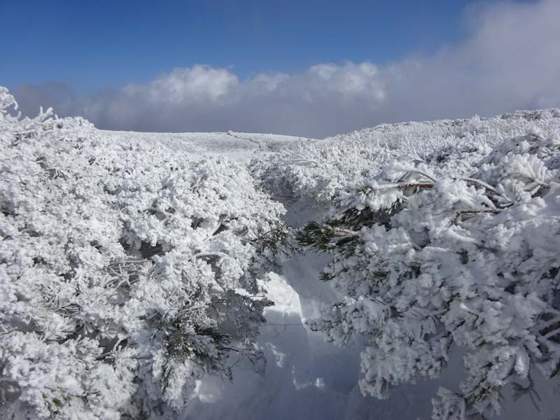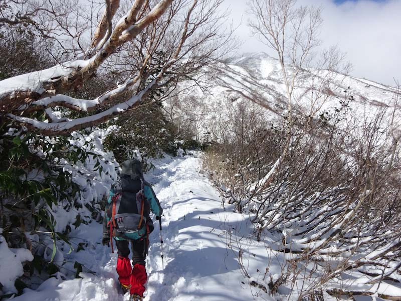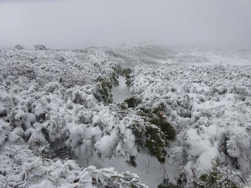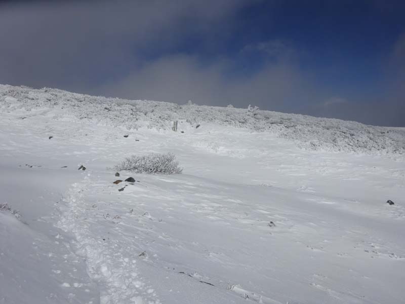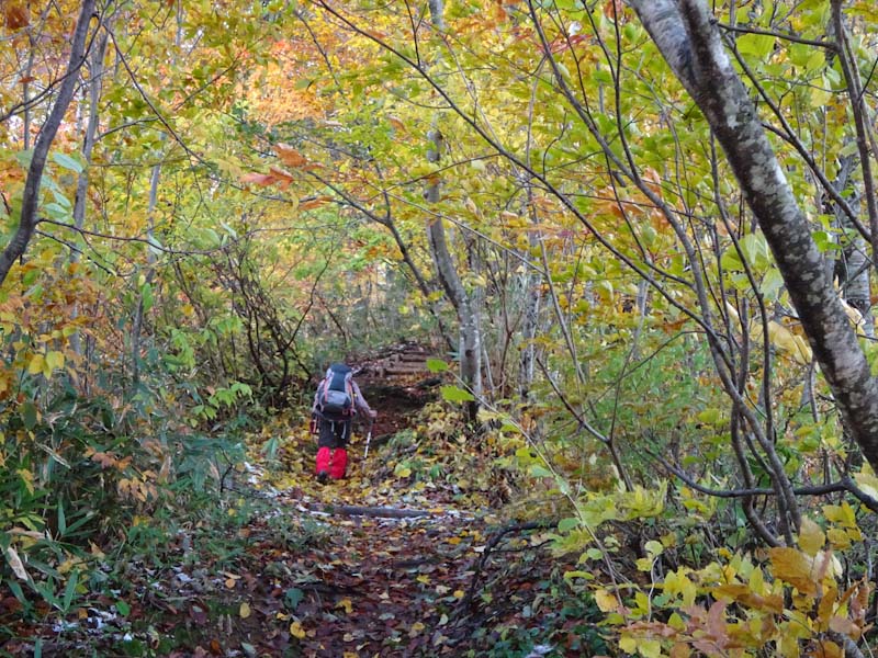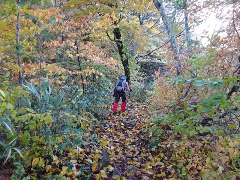 日曜日ともあって、多くの登山者が押し寄せていた。白水湖登山口にさえ、ちょっぴり片隅に雪があった。すぐに雪が現れ、紅葉とのマッチングが素晴らしかった。2キロくらいから雪道になり、3キロでは完全な冬山であった。私達はそこでアイゼンを着けた。登山道は踏み固められ、そのままでも良かったのであるが、知人から頂いたアイゼンの ” 試し履き ” もあった。