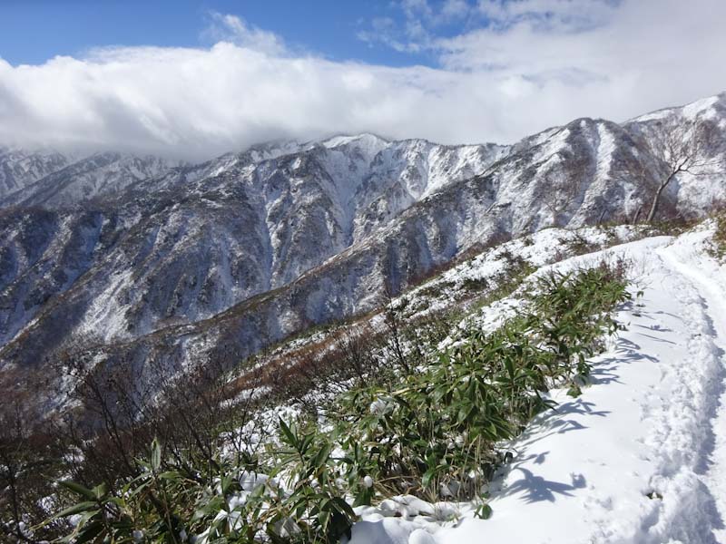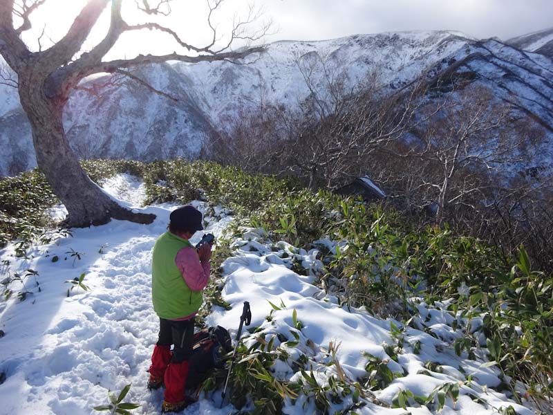 大倉山避難小屋まで行かないで戻って来られる方々が続出していた。また、同避難小屋で待機の方も多かったようだ。それより上は、雪量も増え、強風に煽られるとの情報が飛び交っていた。我々も「山ノ神」の歩きでは、到底山頂どころか室堂までも覚束ない状態になって来ていた。何せ、写真撮影もあるが、皆に追い抜かれて行く状態であったのである。