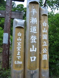 霧雨の中、九十九折で始まる登山道が、やがてブナ林の中の階段状と変わり、15~20分後に登山道らしくなるが、室堂まで5.9キロ、大白川まで1キロの標識の所で水分補給休憩となる。