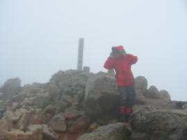青石という標識を過ぎ、高天原の標識を越えた頃から、雨風が強くなる。風もさることながら、雨が痛く感じ、まるで霰に叩き付けられているようであった。ようやくの事で山頂に辿り着いたが、山頂の標識前に立っておれない状態であった。