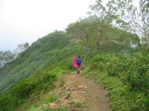 雨は霧雨となり大した事はなかったが、強風が吹き荒れているため、左が崩壊している所を通過するのに、へっぴり腰にならざるを得なかった。谷側から吹き上げるから良いようなものの、山側から吹き降ろしたら怖くて渡れなかったかもしれない。