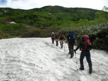急斜面の雪渓を渡る |