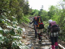 登山道は、クネクネ曲がっているが、お花が咲き始めているし、青空が覗くようになり、