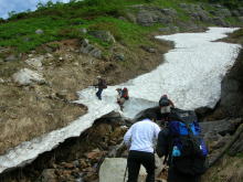 ヒュッテ手前の残雪を行く |