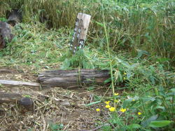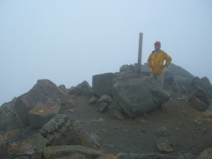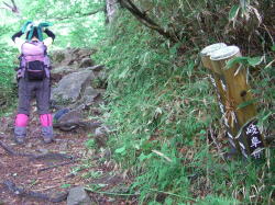 相変わらず霧雨が降り続いていたからか、それとも時間に煽られたからか、分からないが、「山ノ神」は、私だけに山頂行きを勧めた。飲む時間?を与えるために、往復40分の時間をもらい先を急いだ。山頂のあの立派な方位盤が、(地震で?それとも・・詳しい事はわからない。)倒れていた。パシャパシャと4回シャッターを切って、室堂に帰った。